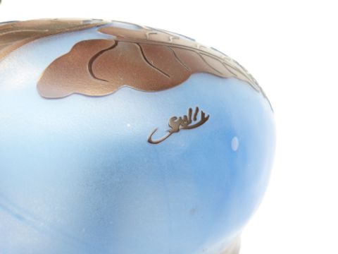 An overlaid cameo glass table lamp with red floral decoration over blue ground, signed to the shade Galle, 67cm tall.