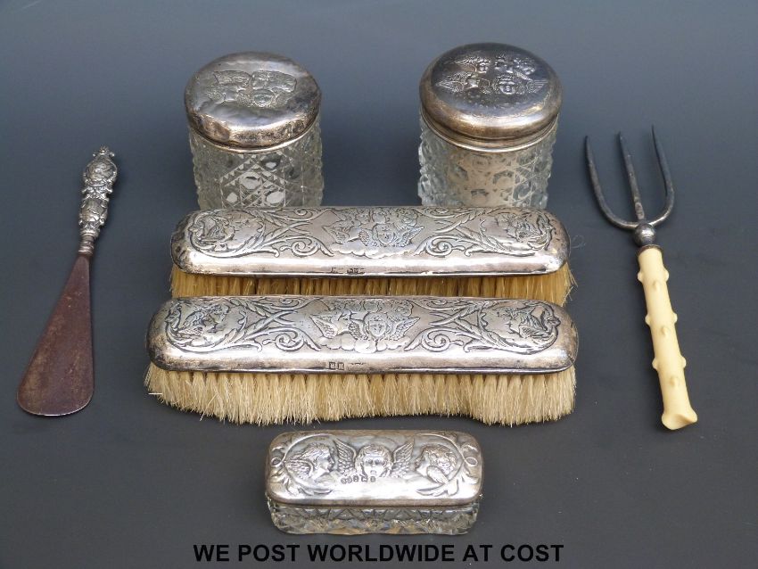 Three hallmarked silver dressing table pots with cherub decoration to the top and two hallmarked silver brushes with cherub decoration