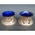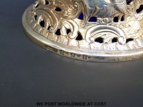 A pair of Irish hallmarked silver pierced and flared dishes or potato rings decorated with pastoral scenes with vacant cartouches and blue glass liners, Dublin 1904 maker James Wakely and Frank Clarke, 12 cm diameter (weight of silver 273g)