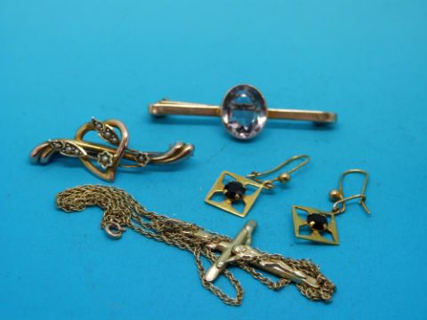 A quantity of 9ct gold including seed pearl bar brooch, smoky quartz, earrings etc