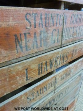 Five local interest vintage wooden crates, some with lids, comprising four L.Hawkins, Staunton Court, Gloucester the other Sandoe and Sons, Gloucester
