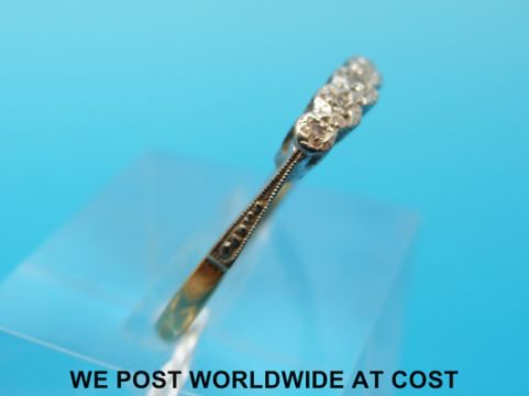 An yellow metal ring marked 18ct set with five diamonds in a platinum setting (size P)