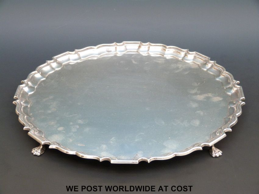 A hallmarked silver salver with gadrooned edge raised on four lions paw feet, Birmingham 1958 maker Barker Brothers Silver Ltd., diameter 36cm (1320g)