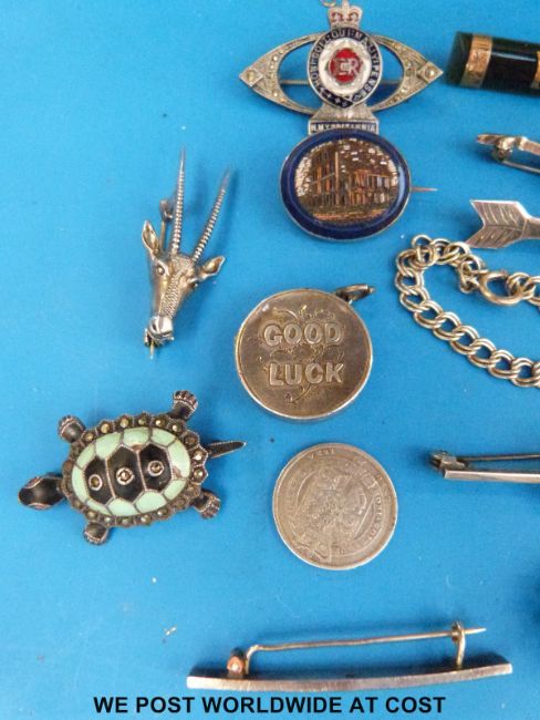 A collection of brooches including yellow metal micro mosaic brooch, jadeite brooch, silver bracelet and necklace