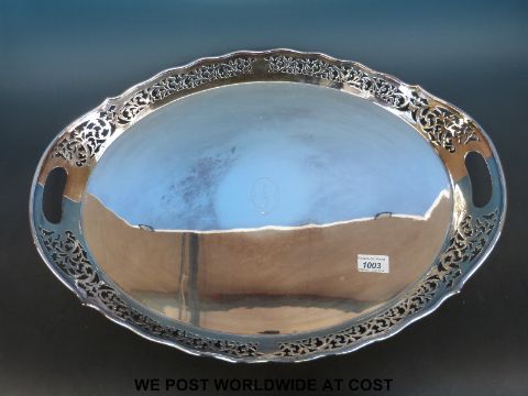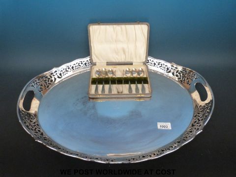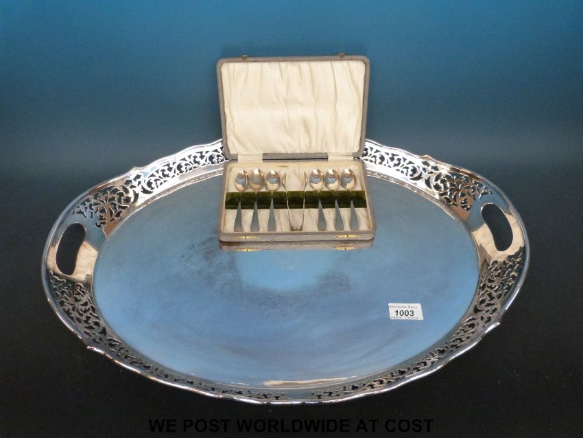 A large oval silver plated tray (diameter 58cm) together with a cased set of plated teaspoons