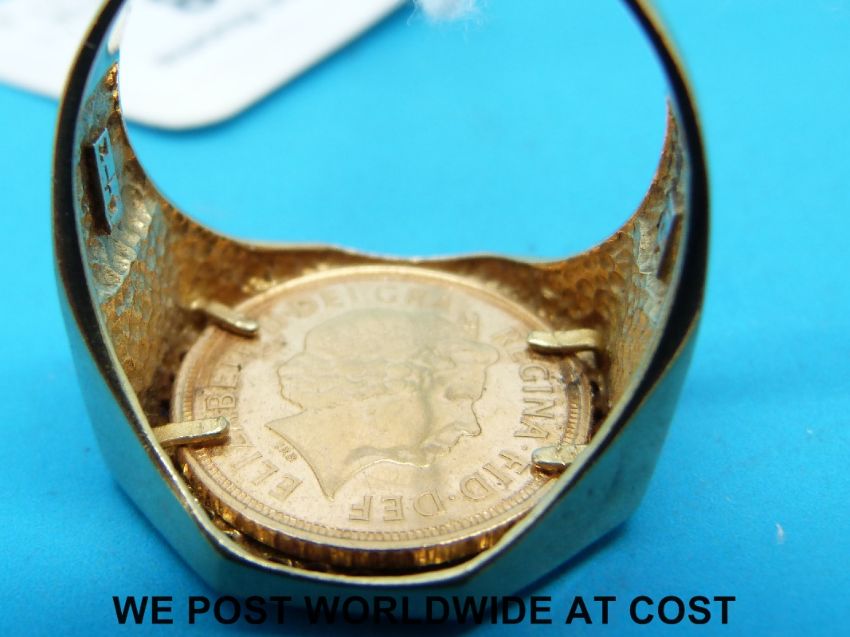 A 9ct gold ring set with a 2006 gold half sovereign, the shoulders set with diamonds and rubies in the St. George's flag (11.7g)