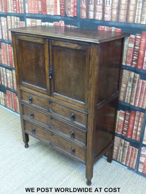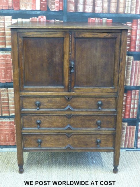 An oak cupboard with three drawers below (width 90cm, depth 44cm, height 122cm)
