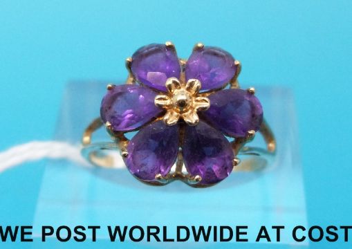 A 9ct gold ring set with amethyst in the form of a flower (size O)