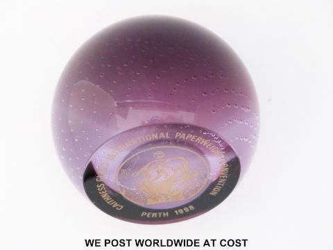 Five Caithness glass paperweights, 'Argon' limited edition 139/750 with certificate (80mm in diameter) 'Gazebo' limited edition 847/1000 (73mm in diameter) 'Royal Wedding 'Moonflower' limited edition 827/1500 (80mm in diameter) 'Caithness Glass International Paperweight Convention Perth 1998' (80mm in diameter) and 'To Commemorate the Millennium Year 2000' (73mm in diameter)