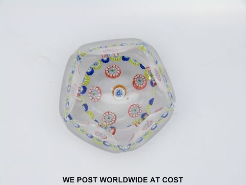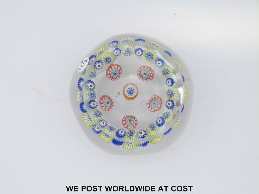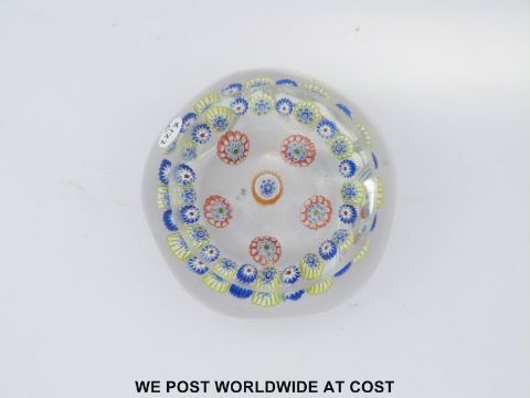 St Louis rondello patterned millefiori faceted glass paperweight with six roundels of red, white, blue and orange canes surrounded by a ring of alternating green and blue canes and six facets, 60mm in diameter
