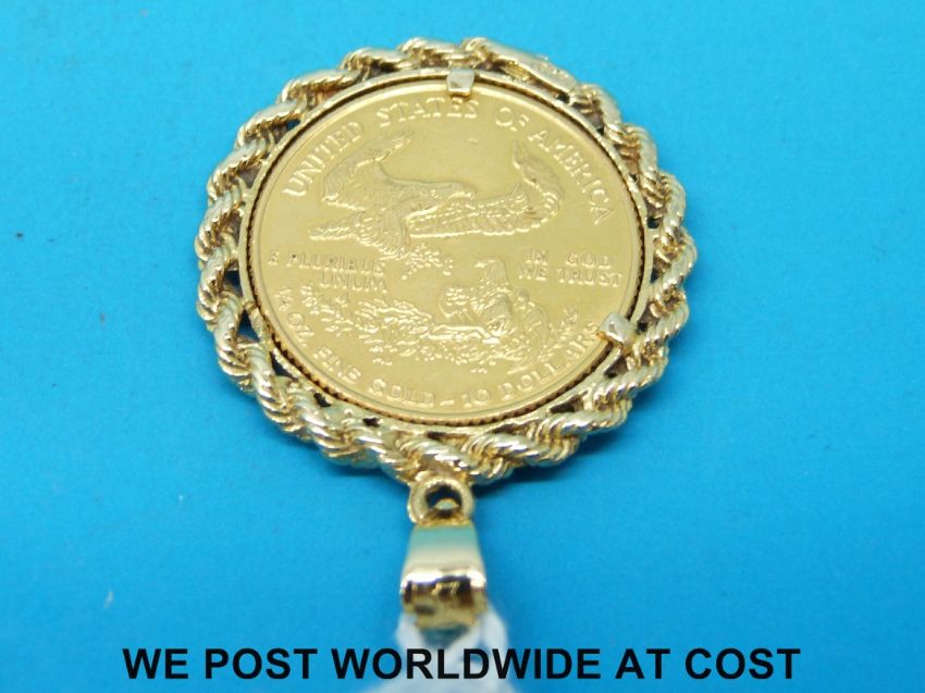A 2000 Liberty 1/4oz ten dollar coin in yellow metal mount marked 14k (13.1g)
