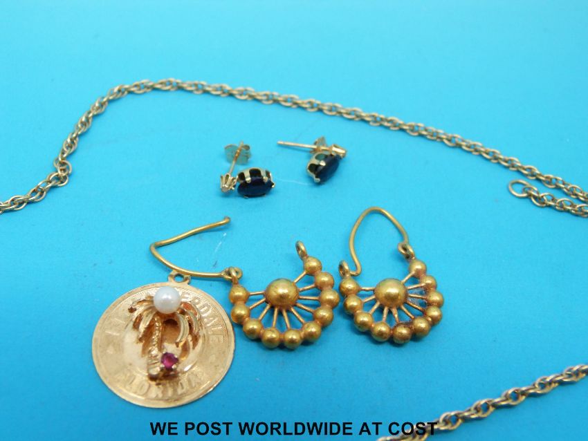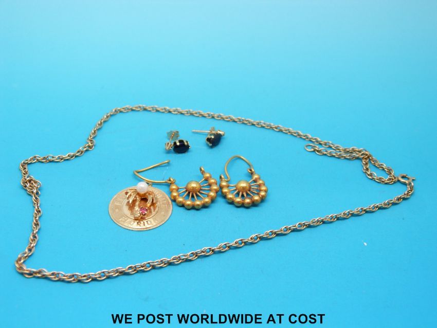 A 9ct gold necklace, 14ct gold pendant set with a ruby and pearl and two pairs of earrings