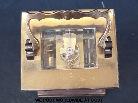 A French brass carriage clock with alarm, 'L'Epee Fondée en 1839, Saint Suzanne, France' to dial, Breguet style hands, plain case and scalloped handle