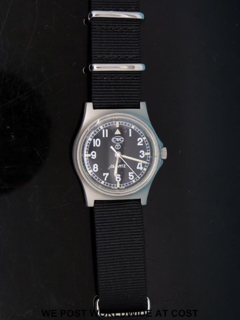 Cabot Watch Company (CWC) G10 military issue wristwatch with luminous hands and markers on black face, marked to the back of the case 'W10/6645-99 5415317 2615/06', on black canvas strap, case diameter 37mm.