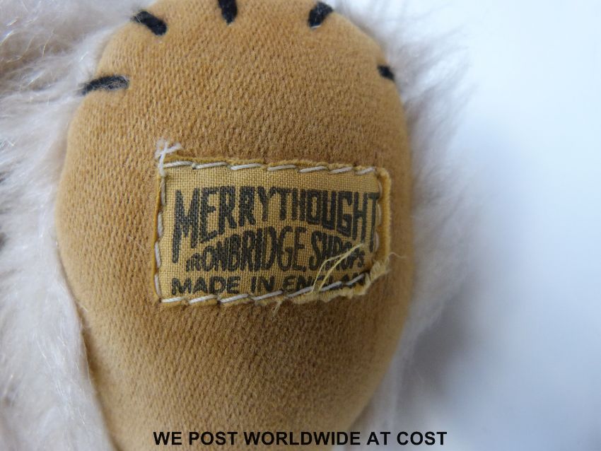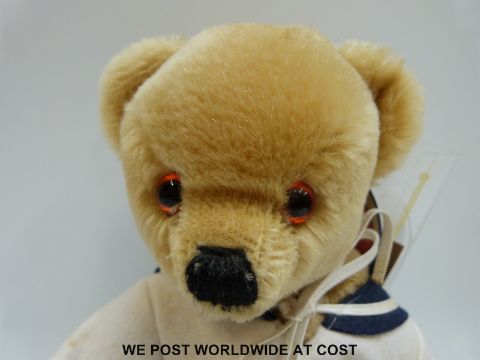 Two Merrythought Teddy bears, one limited edition sailor with shaved mohair in original box the other with long fur and bells in the ears.