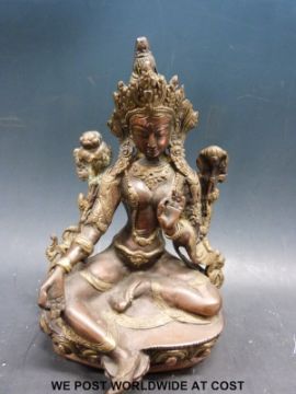A Chinese or Tibetan bronzed model of the goddess Tara seated on a lotus throne (21cm tall)
