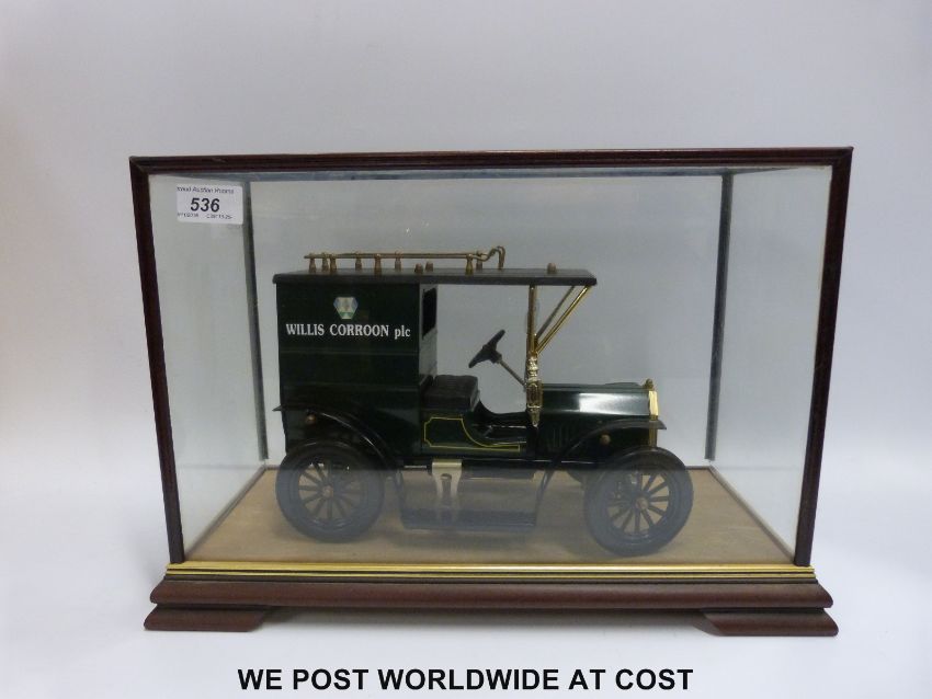 A tinplate model car in glass and mahogany display case