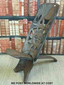 A carved Chinese mirror with dragon decoration together with a book rack