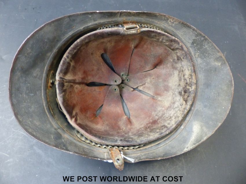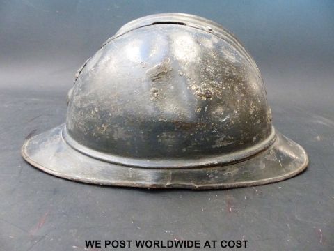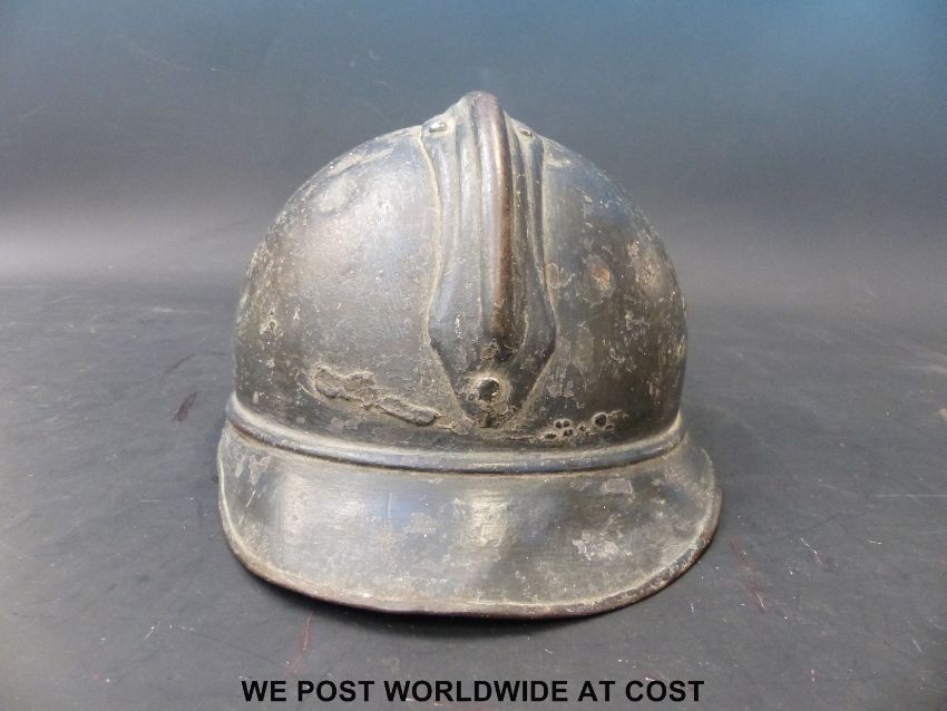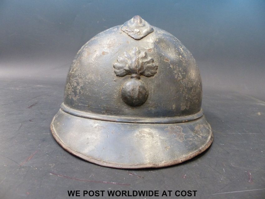 A French WWI military helmet with RB and flaming grenade to front, of four piece construction (comb, bowl and two piece visor)