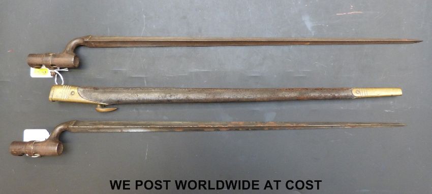A British 1853/72 socket bayonet, to fit Martini Henry rifle, complete with third pattern scabbard with combined topmount and frog stud, WD mark to blade with crown, 16E '96 below and QG 56000, 28 to other side, blade length 54 cm together with another example without scabbard