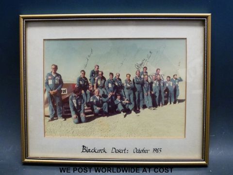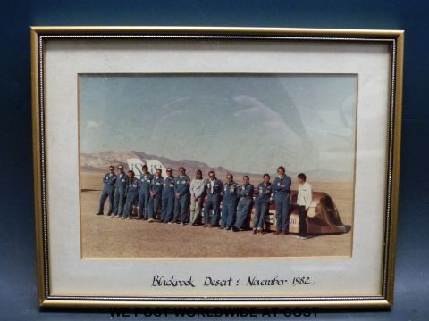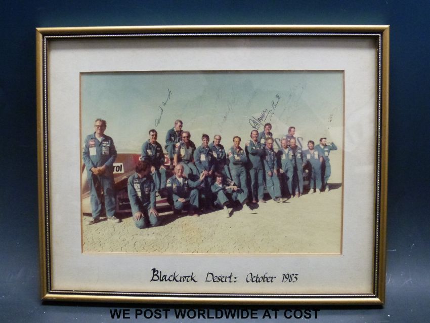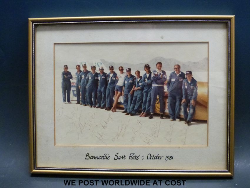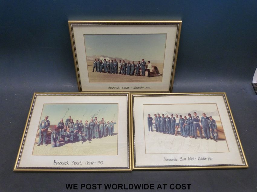 A set of three framed signed Thrust 2, Richard Noble world land speed record team photographs, with around 15 signatures to each, dated 1981, 1982 and 1983