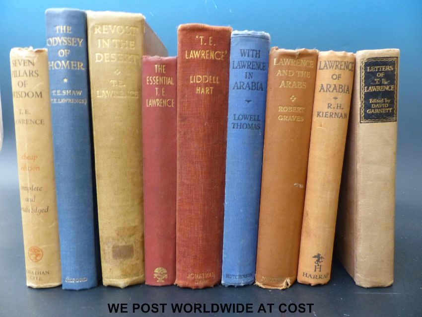 A quantity of T.E. Lawrence books including Revolt in the Desert, Seven Pillars of Wisdom, The Odyssey of Homer, Letters of T.E.Lawrence and The Essential T.E.Lawrence. Also included is a collection of works about Lawrence including Lowell Thomas, With Lawrence in Arabia, Robert Graves, Lawrence and the Arabs and Liddell Hart, T.E.Lawrence