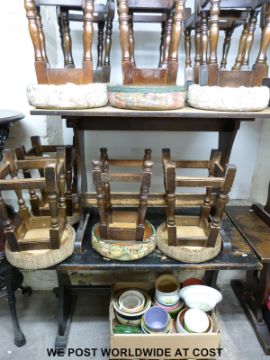Two oak refectory pub tables and ten stools (tables H72 x L122 x D65cm)