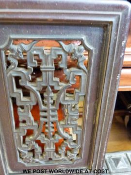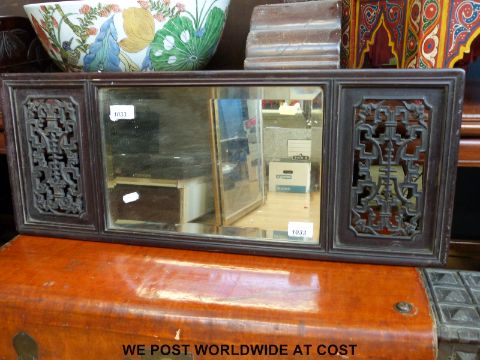 A mirror in Chinese hardwood frame with fretwork panels (76 x 29cm)