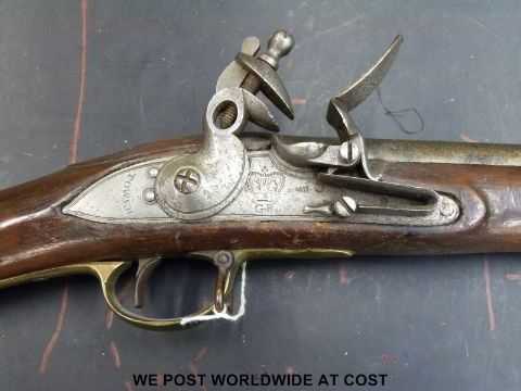 Tower flintlock hammer action Brown Bess gun with tower and crown over GR cipher to lock, brass mounts and 39in barrel numbered 62 together with brass mounts stamped F36, (overall length 139cm)