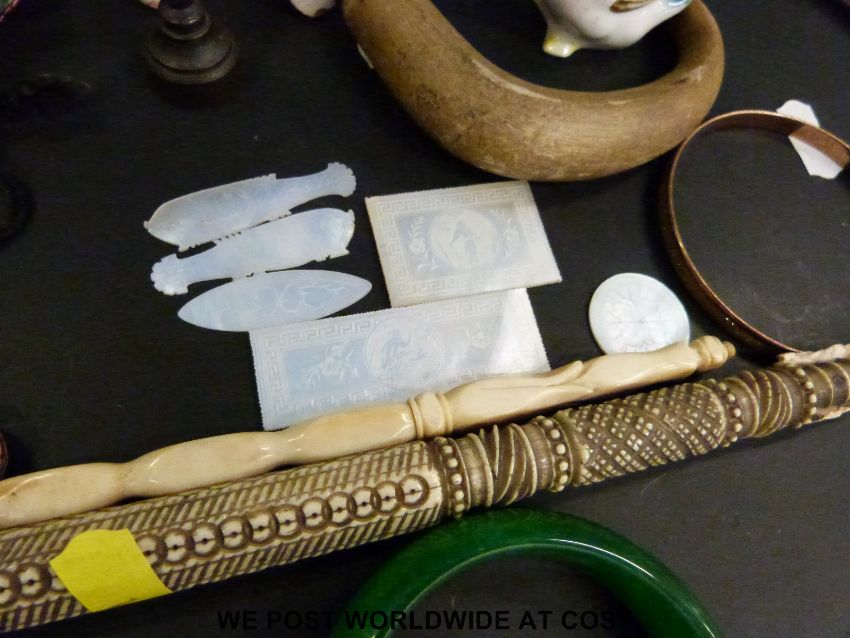 A collection of Chinese jadeite, ivory items, horn walking stick handle, horn necklace, mother of pearl counters, Cicada snuff bottle etc