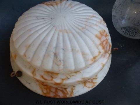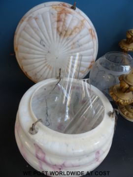 A quantity of glass light shades includes 1930's examples, chimneys etc