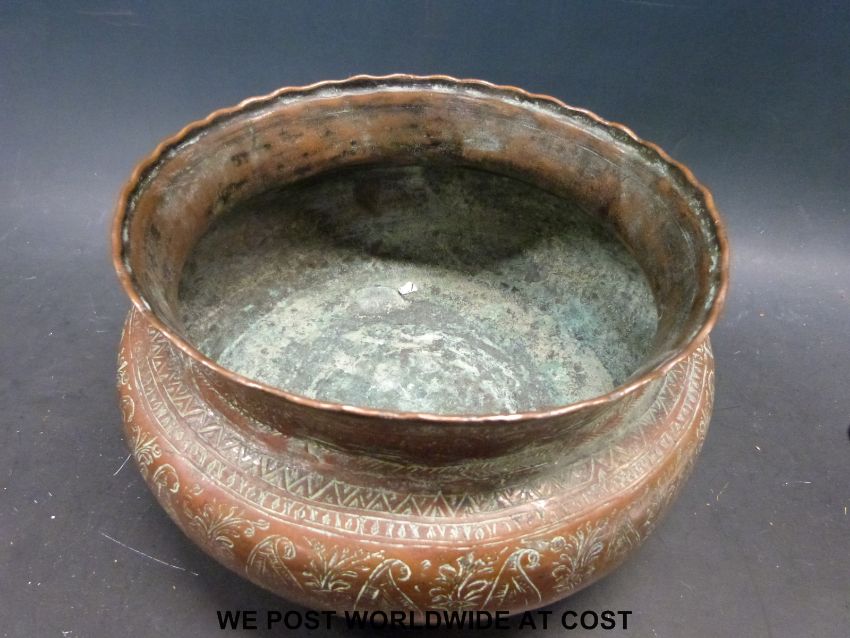 An 18thC copper Safavid Islamic copper bowl with flared rim, engraved with boteh and inscriptions (23cm diameter)