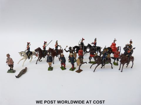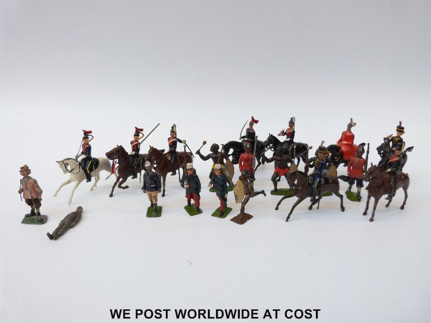 Twenty Britains hollowcast lead soldiers including four Zulu warriors, 9th Royal Lancers Cavalry soldiers, etc