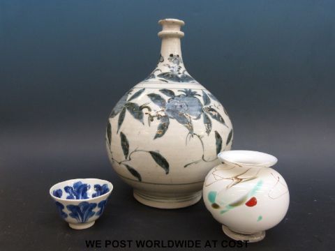 A 19thC Chinese pedestal bulbous vase, 19thC wine cup and a cased glass vase