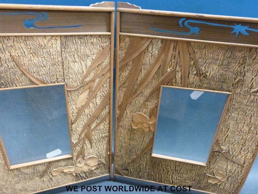 A Japanese double picture frame and a Japanese box both decorated with irises