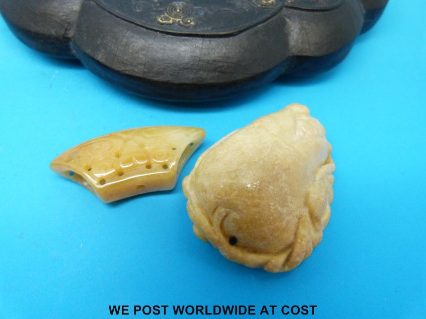 A Chinese ink block in fitted case, two hardstone carvings and a carved wooden stand