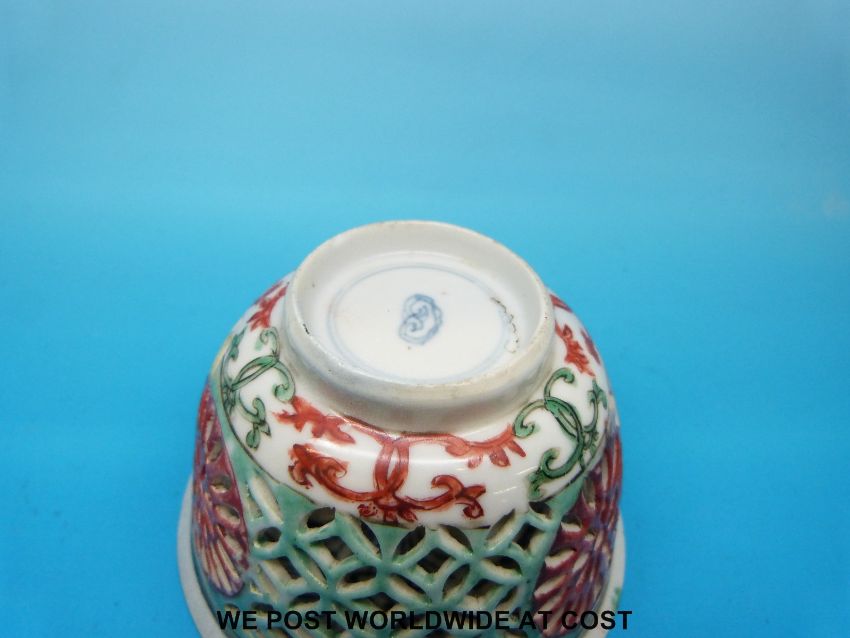 An 18th/19thC Chinese famille vert tea bowl with open lattice work with another layer of blue and white visible beneath