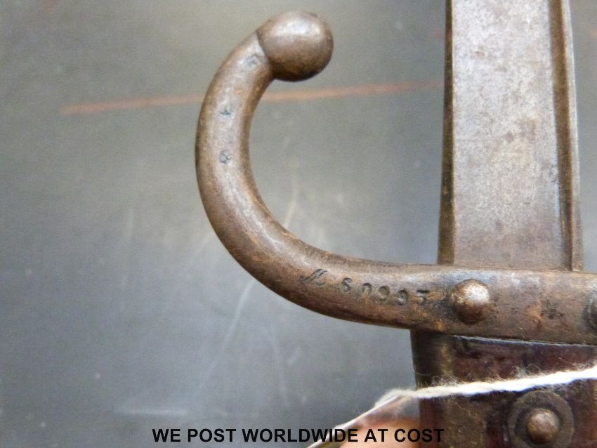 A c1878 French bayonet with the narrow 'T' form blade, with wood grips and brass pommel. Overall length approximately 64.3cm, blade length approximately 52.2cm, M S stamped to blade, M60993 to quillon, further cyphers r, m and other marks
