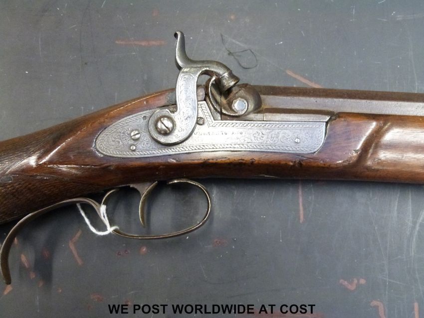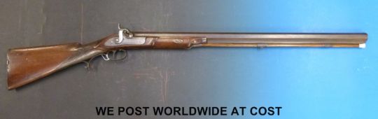 John Manton & Son 10 bore percussion hammer action rifle with 31in octagonal Damascus barrel stamped with Eastern script, ornately engraved and named cock and stylised dolphin hammer, oak ramrod and chequered grip (overall length 120cm)