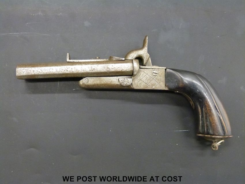 Double barrelled side by side pinfire hammer action pistol with carved grip, engraved locks, folding triggers and 4.5inch octagonal barrels (overall length 23cm).