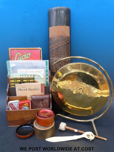 A collection of ephemera in oak stationery box, together with a photo album, 'magic wallet', brass gong and oriental items