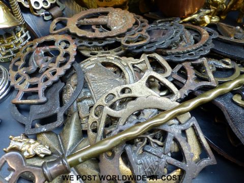 A quantity of brassware etc. to include horse brasses, vases, figures, etc. together with a contemporary banjo style barometer