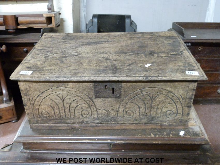 An antique carved oak bible box (H25 x L65 x W43cm)