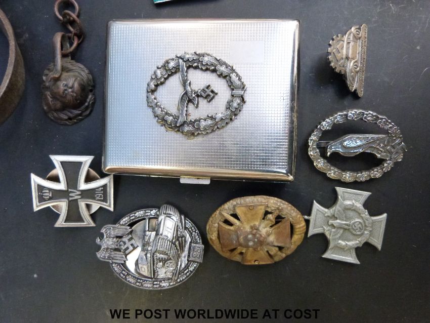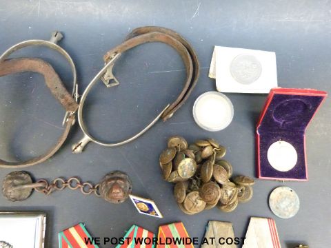 A WWI medal pair awarded to 135494 Gnr J J George R A together with three WWII medals and various other militaria and collectables including .999 fine silver gaming token, buttons, stripes etc.