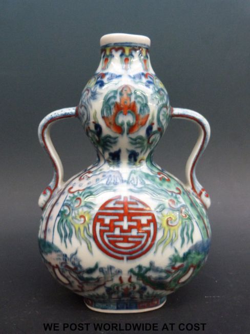 A Chinese twinhandled double gourd vase decorated with a shou medallion on the lower bulb with Qianlong Seal mark (18cm tall)