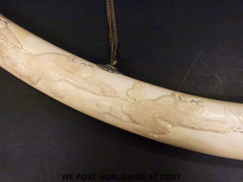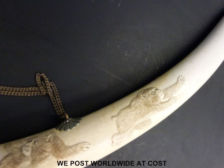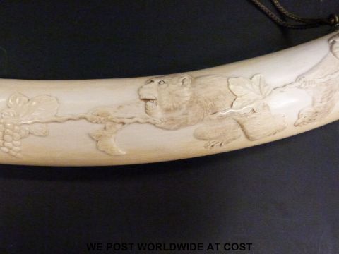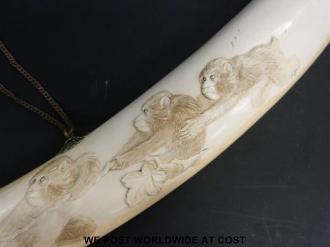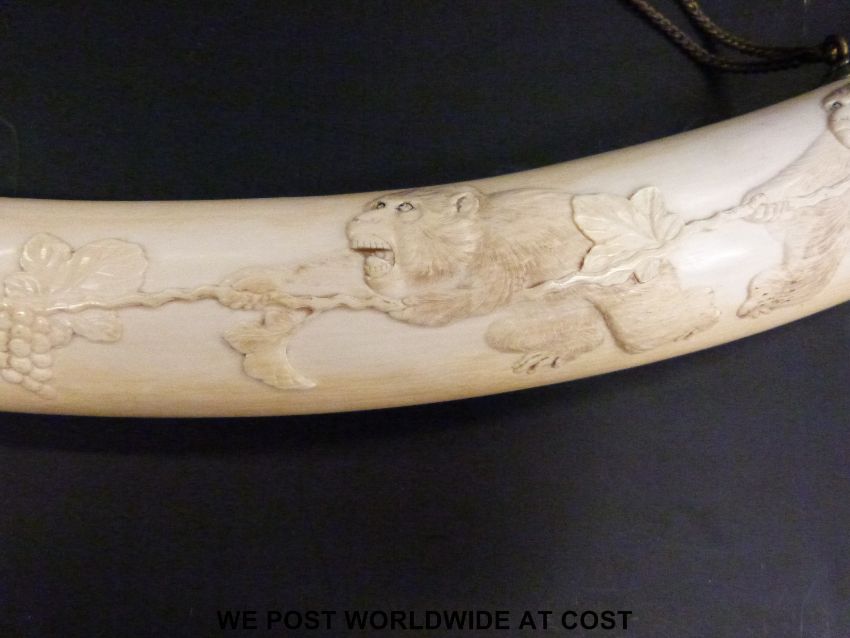 A Japanese Meiji period finely carved elephant ivory tusk. One side carved with monkeys playing tug of war, the other side with a comical scene of five monkeys, the central monkey with a snake around his ankle with the two either side running away in fear (length approximately 84cm)