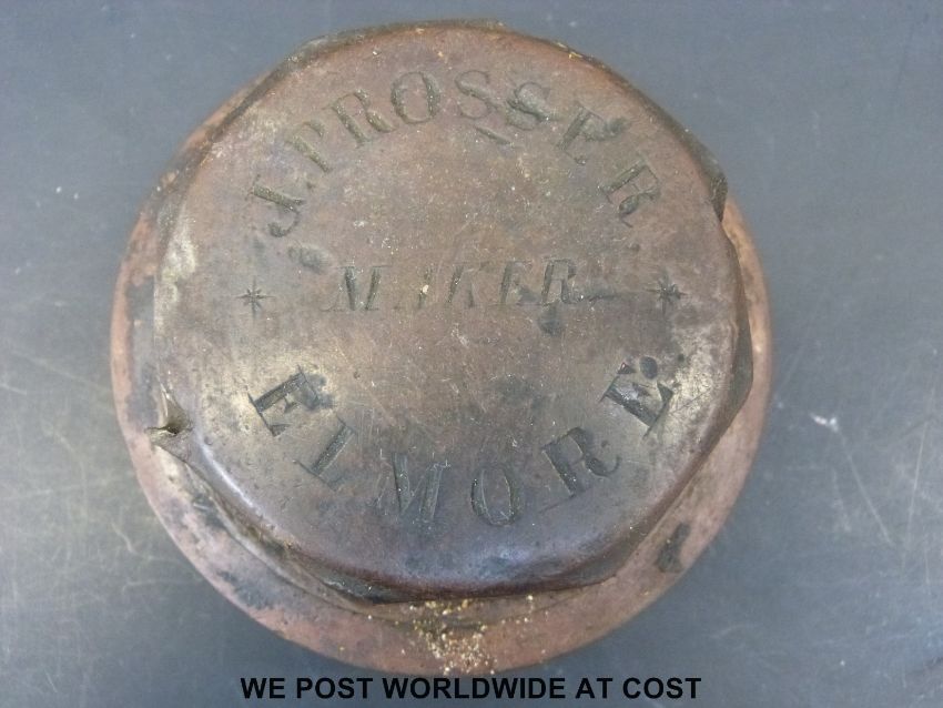J. Prosser Elmore cart or similar brass hubcap, of local Stroud interest together with a J.Sessions & Sons sanitary engineer's ceramic plaque