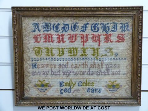 Two early samplers, one dated 1849 (19 x 42cm) the other undated but made by Emily Coles aged 12 years (39.5 x 29.5cm)