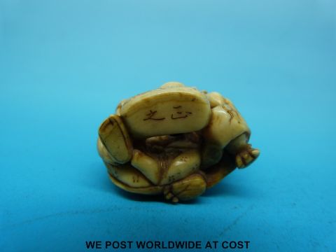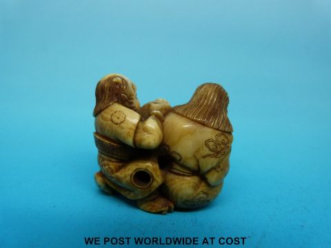 A Japanese Meiji period signed carved ivory netsuke of a horned figure pouring liquid into a woman's bowl (3.3cm tall)