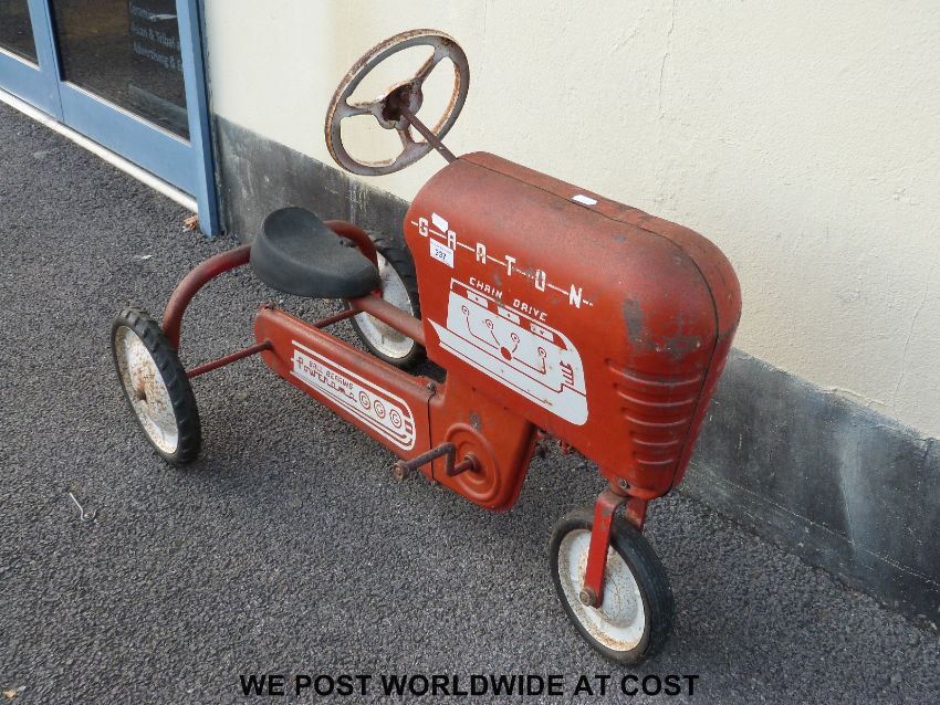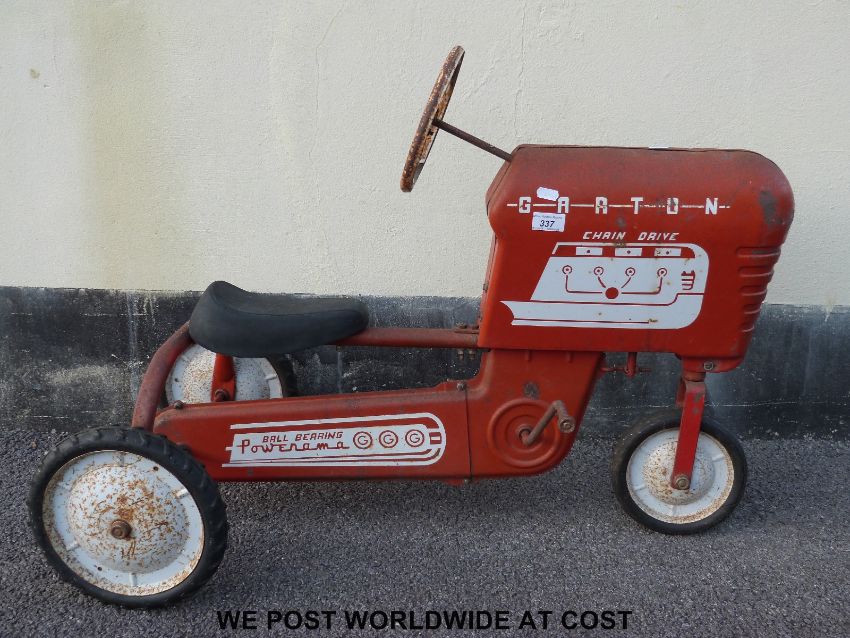 GGG Powerama Garton tin-plate chain drive pedal tractor in red with white logos, 90cm long.